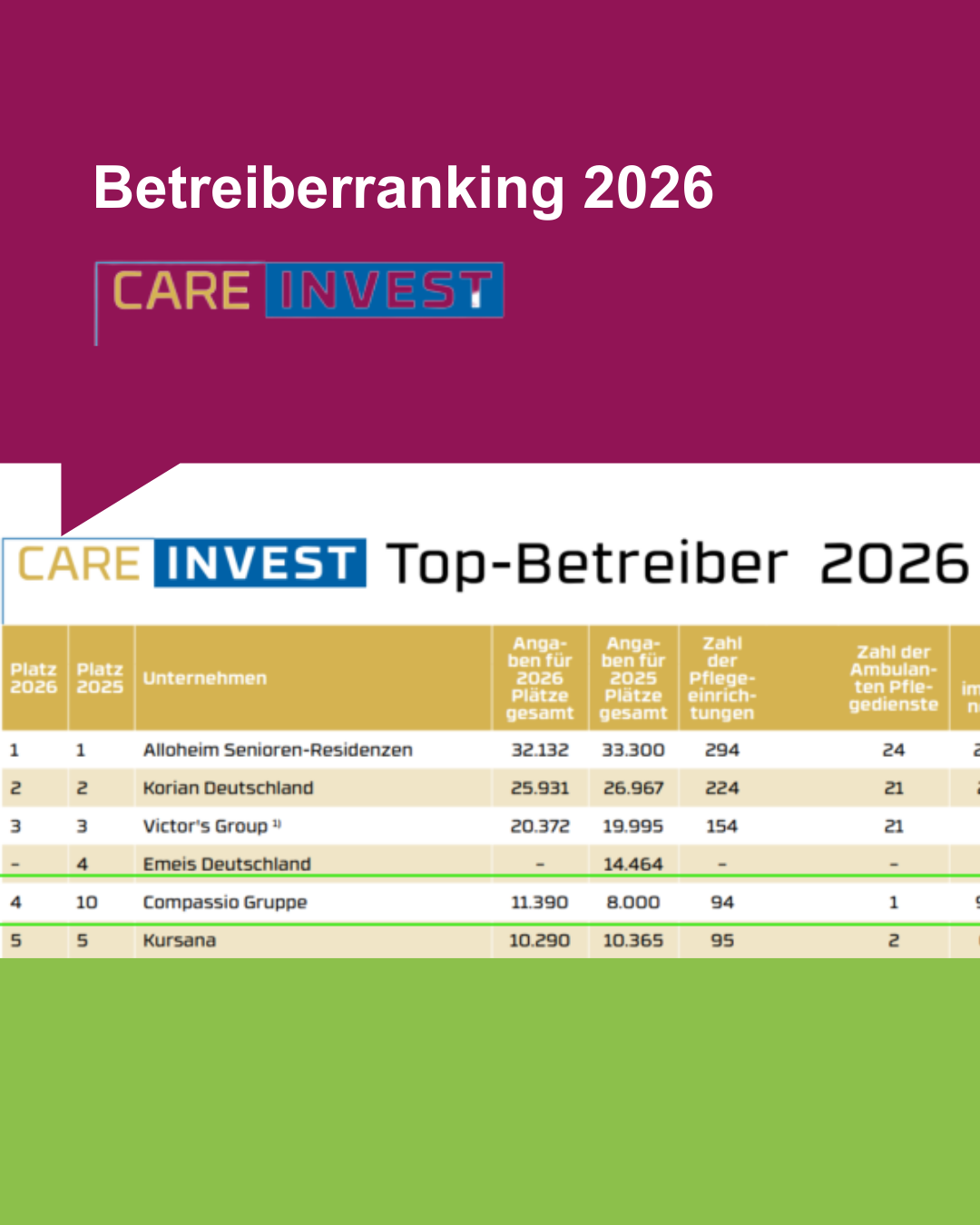 Die compassio Gruppe zählt zu den TOP 5 der privaten Pflegeanbieter in Deutschland. Mit aktuell rund 100 modernen Pflegeeinrichtungen und über 11.000 Pflegeplätzen bietet sie...