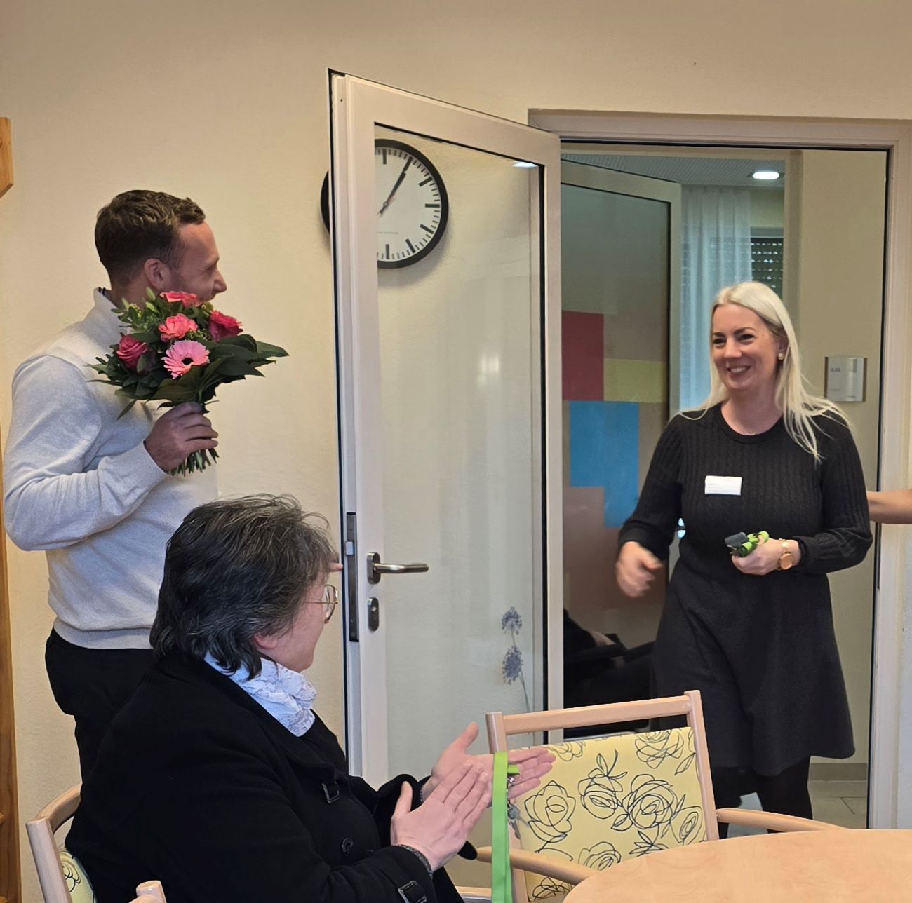Zum Abschied überraschten wir sie mit einem Strauß Blumen, kleinen Geschenken und vielen warmen Worten. Die Freude und Rührung waren auf beiden Seiten groß.