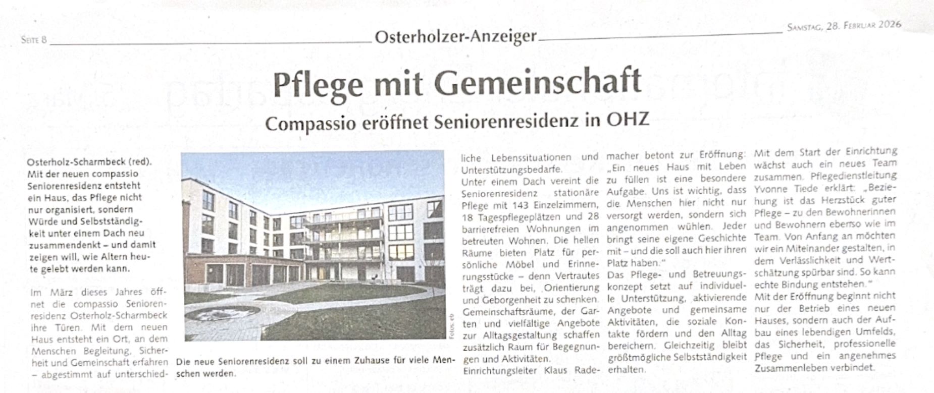 Im Osterholzer-Anzeiger wurde über die Eröffnung unserer Seniorenresidenz Osterholz-Scharmbeck berichtet. Unter dem Titel „Pflege mit Gemeinschaft“ stellt der Artikel unser neues Haus, das Konzept aus stationärer Pflege und betreutem Wohnen sowie unseren Anspruch vor, Sicherheit, Selbstständigkeit und Gemeinschaft miteinander zu verbinden.