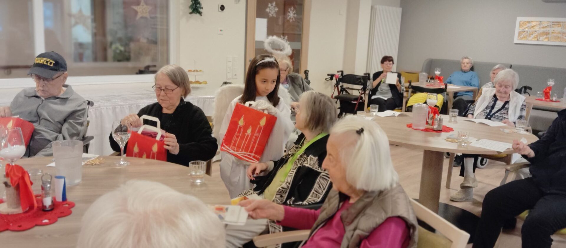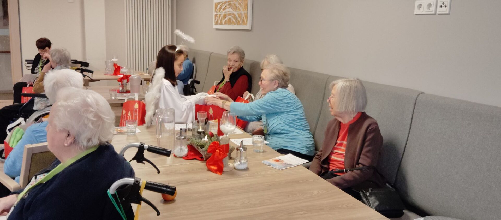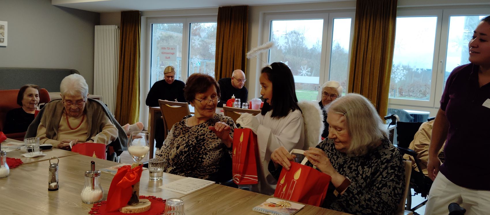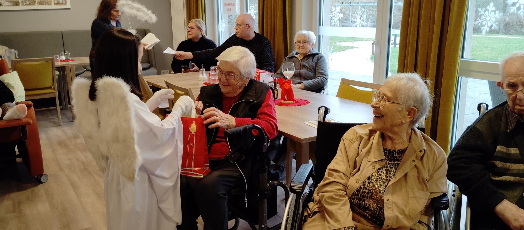 Am Heiligen Abend erhielt das Seniorendomizil Am Grubenfeld besonderen Besuch: Das Christkind schaute bei unseren Bewohnerinnen und Bewohnern vorbei.