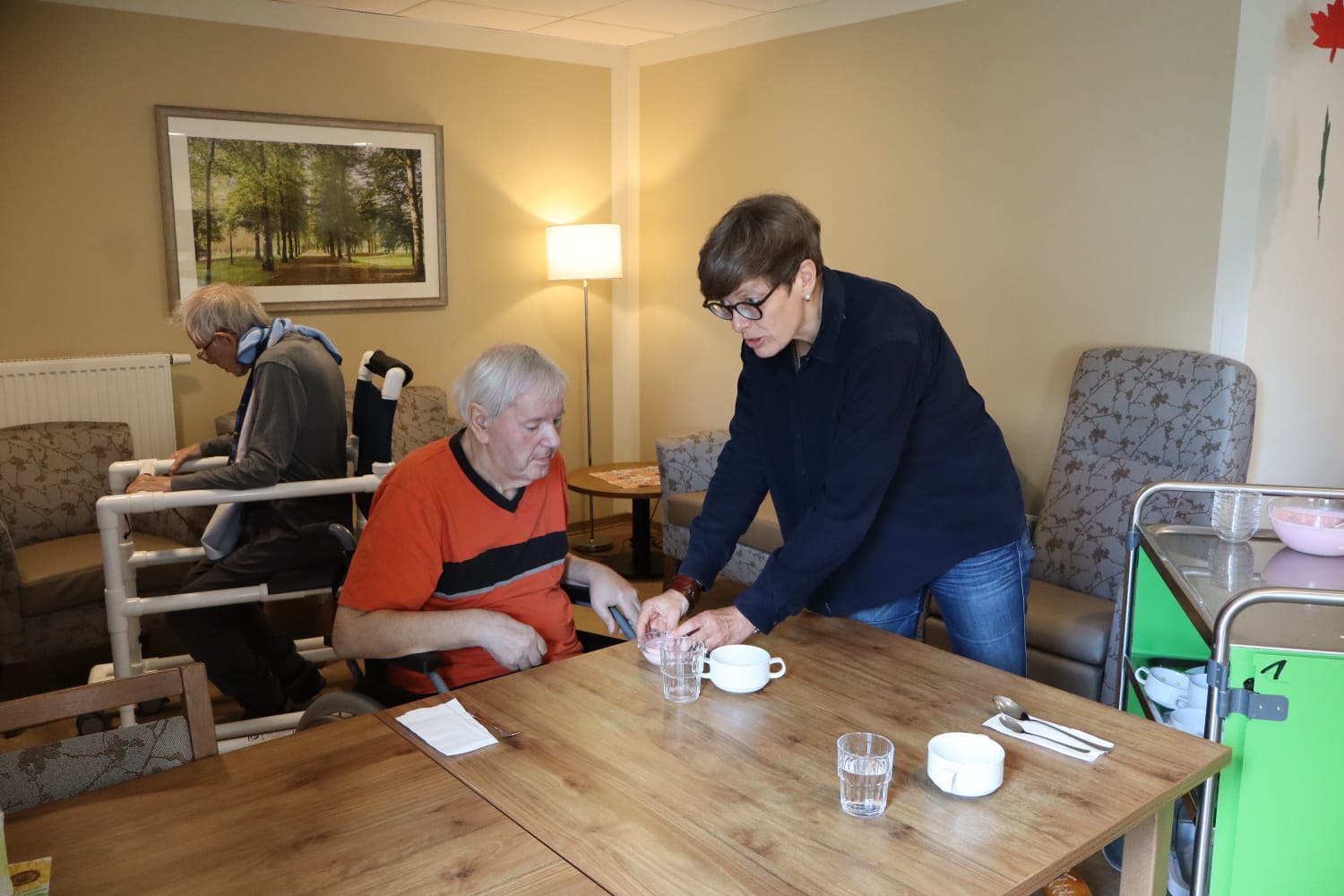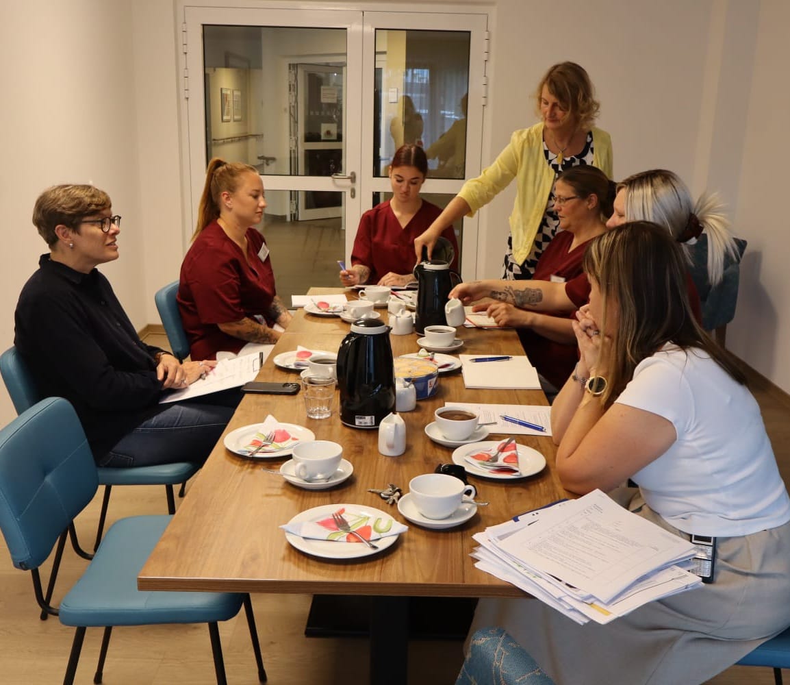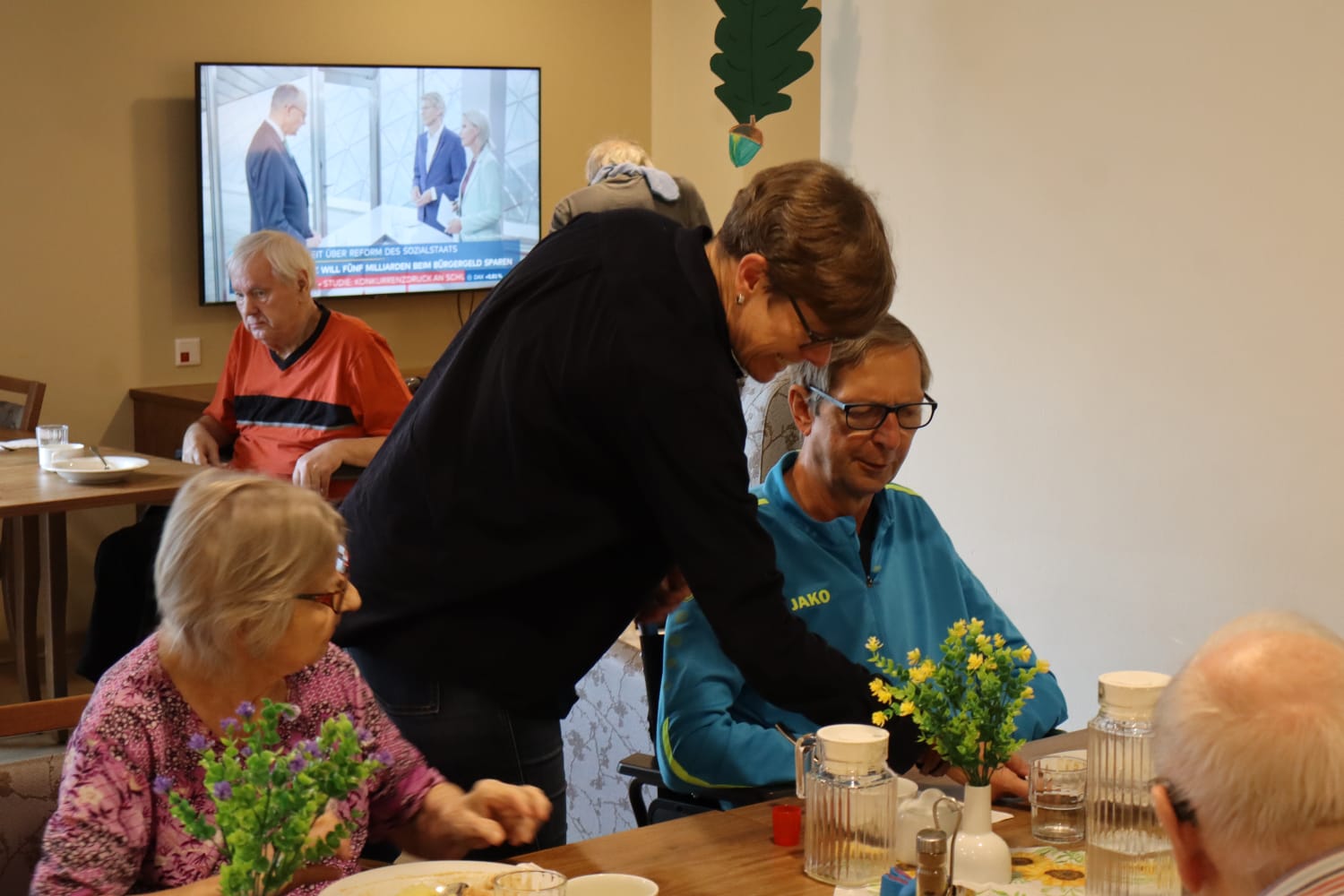 Unter der Leitung von Andrea Sprenger war Monika an diesem Tag überall im Haus unterwegs. Voller Interesse und Neugier unterhielt sie sich mit vielen Mitarbeitenden, nahm an der Blitz- und der Wohnbereichsleiter-Besprechung teil und lernte so die verschiedenen Perspektiven und Herausforderungen der täglichen Arbeit kennen. Doch Monika ließ es nicht bei Besprechungen und Gesprächen bewenden: Sie packte aktiv mit an und half in der Küche, indem sie Gemüse und Zutaten für einen köstlichen Kuchen schnitt.