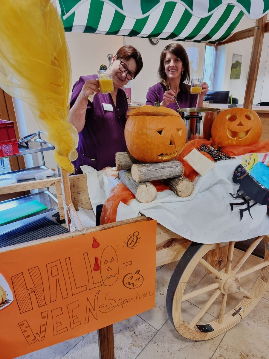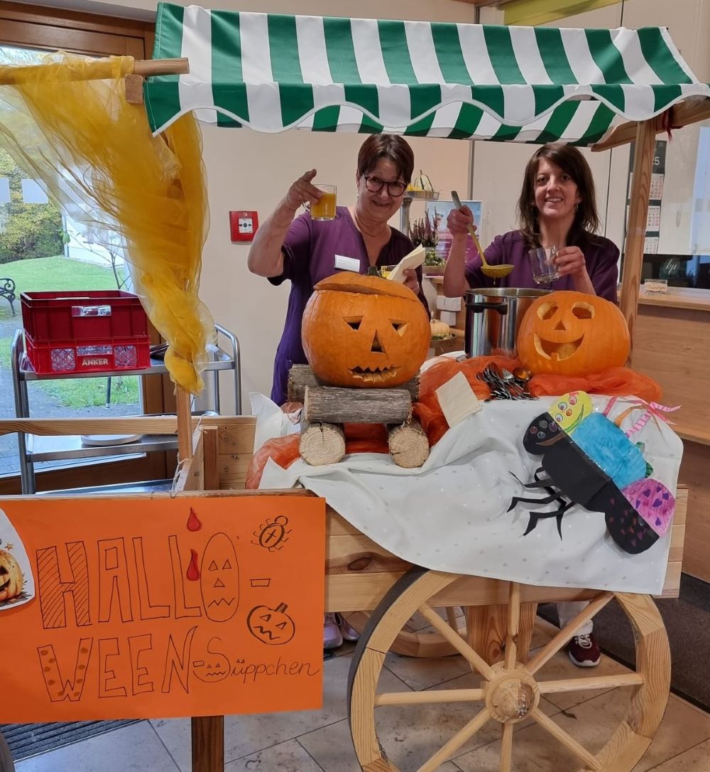 Als der schön geschmückte Wagen – mit Kürbissen, Spinnen und kleinen Lichtern verziert – durch unser Haus rollte, gab es nicht nur Suppe, sondern auch reichlich Herzlichkeit und gute Stimmung. Begleitet von stimmungsvoller Musik wurde erzählt, gescherzt und schließlich sogar gesungen. Die bekannten Lieder ließen niemanden stillsitzen – und schnell war klar: Halloween kann auch gemütlich, verbindend und voller Herzenswärme sein.
