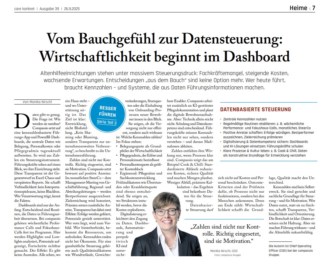 COO Monika Nirschl beschreibt, wie Kennzahlen und Dashboards Führung wirksam machen – nicht zur Kontrolle, sondern als Grundlage für Transparenz, Motivation und eine zukunftsfähige Altenhilfe.