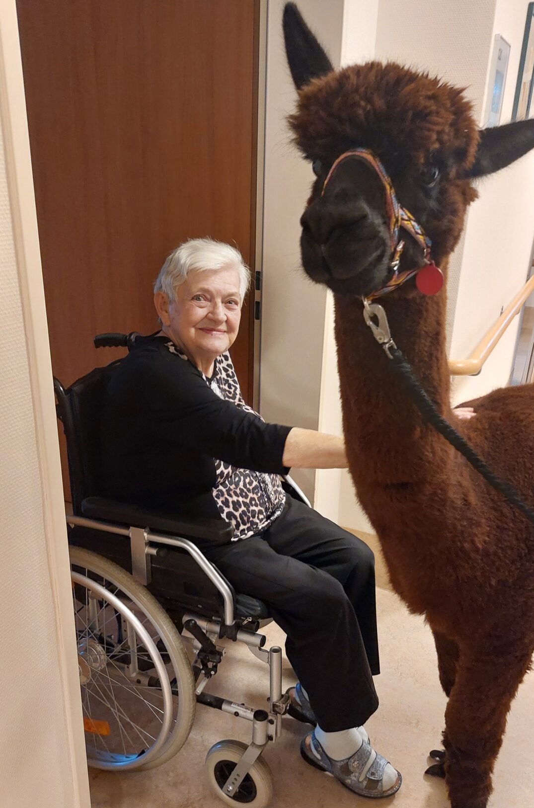 Mittlerweile kennen uns die flauschigen Gäste schon richtig gut – und so lief der Rundgang durch die Wohnbereiche ganz entspannt. Auch die bettlägerigen Bewohner:innen bekamen Besuch und konnten die sanften Tiere hautnah erleben.