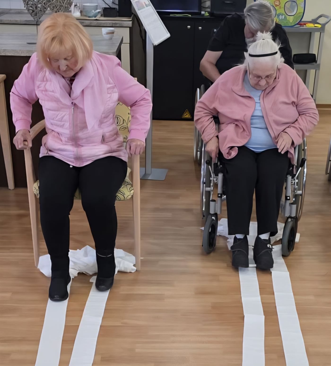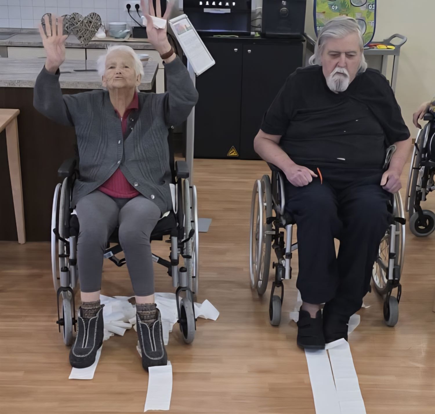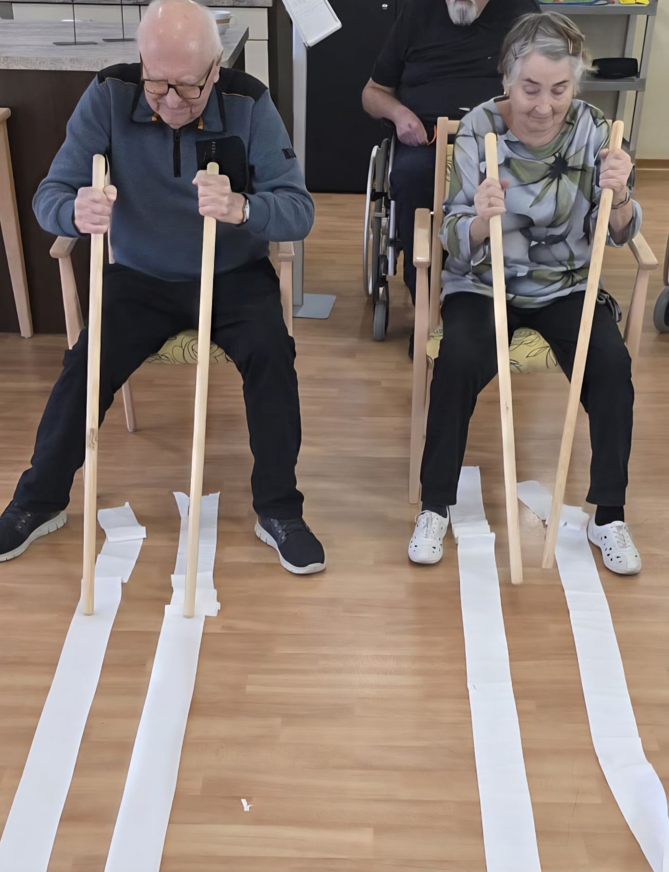 Ein besonderer Spaß war ein Bewegungsspiel, das bei unseren Bewohnerinnen und Bewohnern sowohl Koordination als auch Konzentration forderte. Mit Stöcken, die an das Skifahren erinnerten, und begleitet von motivierender Musik, war der Ehrgeiz groß – und der Spaß noch größer.